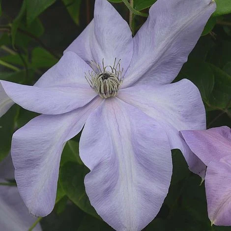 The large mauve flowers of Clematis ‘Shimmer’ are borne in profusion throughout the summer. Flowers begin from a height of around 60cm (2’) and continue all the way up the stem to create a fabulous display. This beauty has a vigorous but reasonably compact habit making it easily manageable whether you grow it in a container, against a trellis or trained through roses on an archway. Height: 180cm (70″). Spread: 100cm (39″). Pruning group 3.