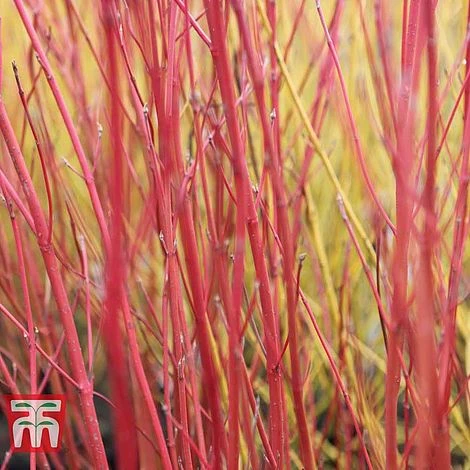 Strikingly vivid red stems of Cornus sericea ‘Cardinal’ make a bold statement in any border or woodland garden during the Winter months. This spreading, deciduous shrub provides so much in your garden with very little effort; white flowers in Spring turn to blue/white berries by Autumn, just when the leaves are also turning red and yellow. An ideal plant for the back of a border or part of a shrubbery. Height: 200cm (79″). Spread: 400cm (157″).