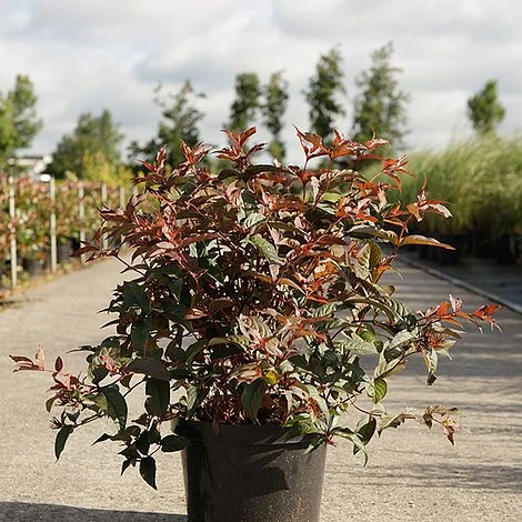 This award-winning Diervilla sports handsome burgundy foliage throughout the season with clusters of contrasting sulphur-yellow, tubular flowers in summer. In autumn, the foliage colour intensifies to bright red and orange before falling. Diervilla splendens ‘Diva’ is a tough and reliable deciduous shrub that is especially useful in partially shaded borders and difficult soils. It requires virtually no maintenance and is drought tolerant once established, adapting to almost any situation. Diervilla ‘Diva’ spreads by suckers, quickly forming a bushy mound clothed in lance-shaped leaves. It makes a useful shrub for a mixed border where its chocolate foliage creates depth and provides a welcome change from the usual greens. It can also be used as a low hedge, as ground cover in massed plantings, or as a container specimen. The foliage makes an excellent filler for cut flower arrangements. Height and spread: 1.2m (4ft).